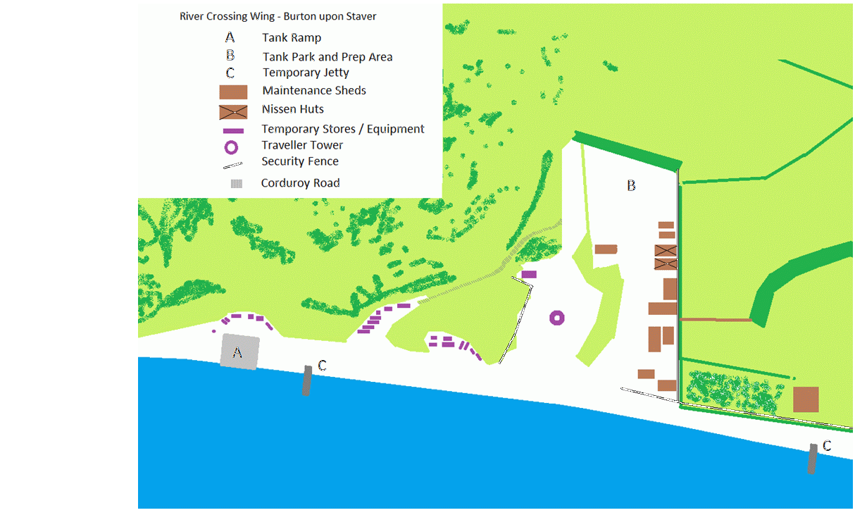 Upon being selected, requisitioned and made secure, Artesian Works Company attended the site to create access to the Trent. They employed a ¾ cubic yard excavator with drag line and long beam, and facilitated the laying of 500 chocolate blocks. In addition, a timber and concrete slipway was constructed, along with a 300m long hogging track and corduroy road. Workshops were constructed to the south of the site, as well as a temporary summer camp for 400 men. In July 1944 the River Crossing Wing opened.
