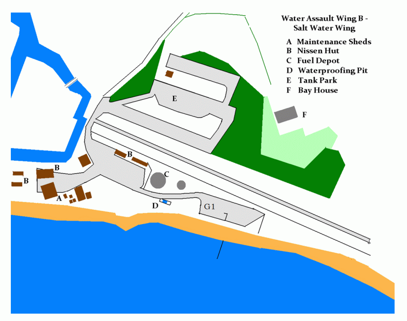 The location of the Saltwater School was Stokes Bay, Gosport, Hampshire. Other suitable areas were reconoitered, including Lee-over-Sands in Essex, Osborne Bay on the Isle of Wight and Bracklesham Bay. The Isle of Wight beaches were deemed most acceptable, but difficulties over accommodation resulted in an area adjacent to Browndown ranges being selected. The site was chosen particularly because of its proximity to Osborne Bay, as well as the presence of existing hards on the beach, and the availability of Fort Monkton for billets. Further particulars of the site included the provision of: