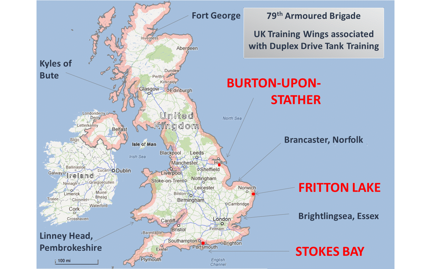 Between April 1943 and May 1944, the 79th Armoured Division utilised a number of locations to undertake trials and training of the DD tanks. Trials occurred in Scotland and Wales, and two Top Secret Training Schools, or 'WINGS', were established. 'A' WING for Freshwater Training was at Fritton Lake on the Norfolk / Suffolk Border, whilst 'B' WING (Saltwater Training) was at Stokes Bay Hampshire. Later in May 1944 a further facility for River Crossing was formed at Burton-upon-Stather.